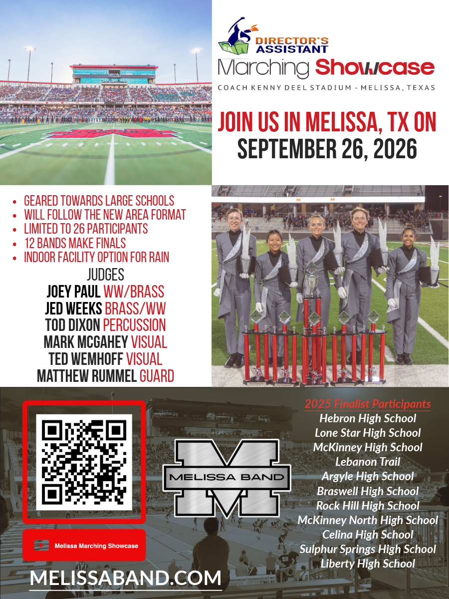 Join us in Melissa, Texas, on September 26, 2026, for the 4th annual Melissa Marching Showcase in the new 10,000-seat Coach Kenny Deel Stadium! The 5A/6A UIL Area Format will be used for this competition, along with guard comments during both the preliminary and final competitions.